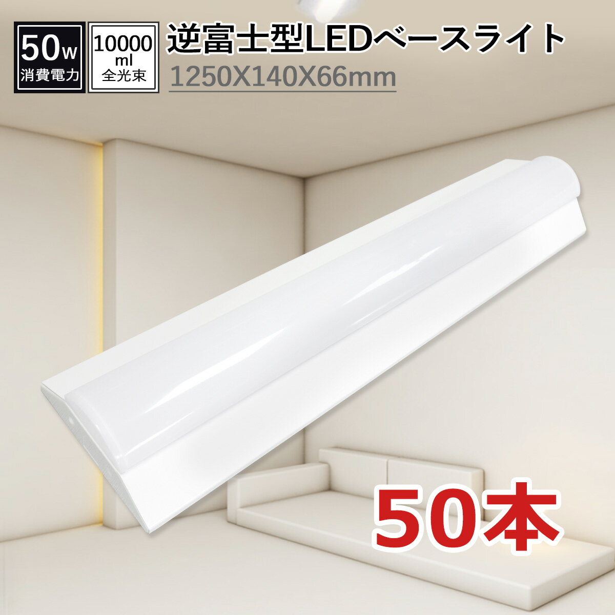 50本セット ledベースライト逆富士 50W 10000LM 蛍光灯器具40w型2灯相当 1250mm*140mm*60mm ledキッチンベースライト 高効率200lm/w led 蛍光灯器具40w型2灯相当 逆富士型照明器具 一体型ledベースライト チラツキなし 防虫 50000H長寿命 即時点灯 PSE認証済 送料無料
