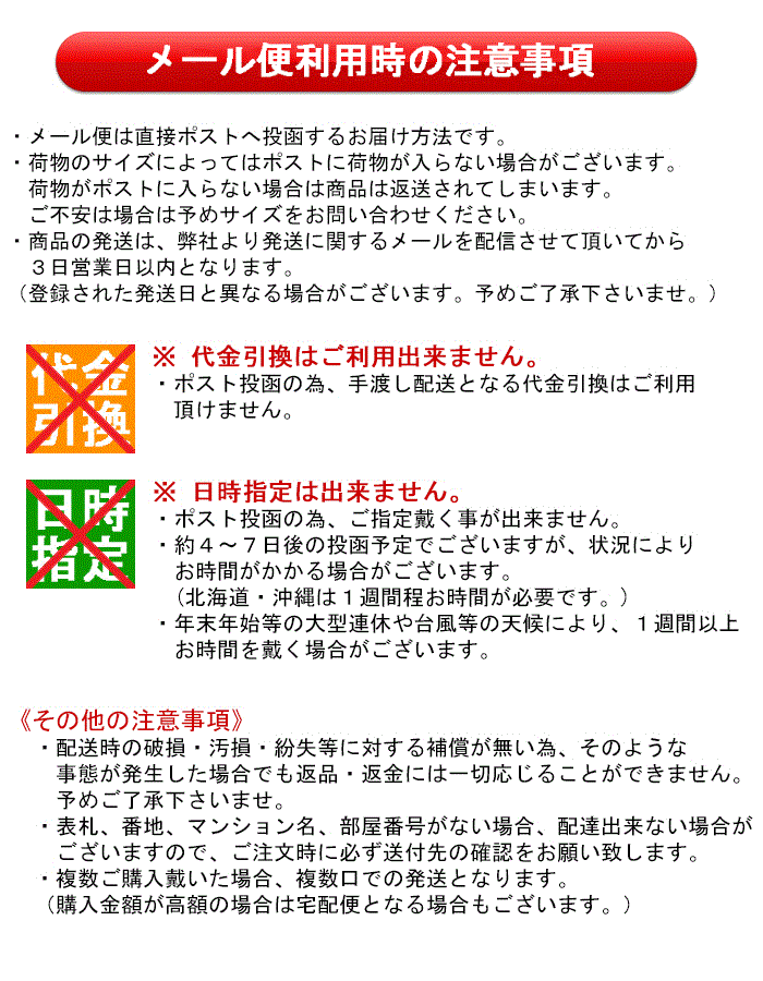 ・メール便発送の為WEB追跡不可(配送業者へお電話にて状況確認可)・日時指定不可。